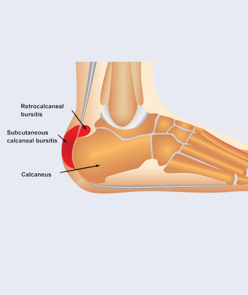 It is literally inflammation of the bursa, a small sac which is located over the heel bone and just ahead of the tendo-achilies which inserts into the heel bone. Symptoms in the form of pain, swelling, redness and discomfort behind and above the heel. Pain typically occurs when the heel is loaded. The causes of this deformity are repetitive trauma, tendo-achilies rubbing against the bursa and causing friction with the heel bone. Retro-calcaneal bursitis can also be associated with achilies tendonitis, plantar fasciitis, fibromyalgia, rheumatoid arthritis. Diagnosis in the form of history taking and physical examination and X-rays, ultrasound, CT- scan and /or MRI. Treatment basically consists of ice application and medication. It also depends on the staging. Stage 1 – pain relief, protection Stage 2 – restoring normal range of motion, strength Stage 3 - restoring full function Stage 4 – preventing a recurrence. Surgery in the form of bursectomy can be considered for chronic symptoms.